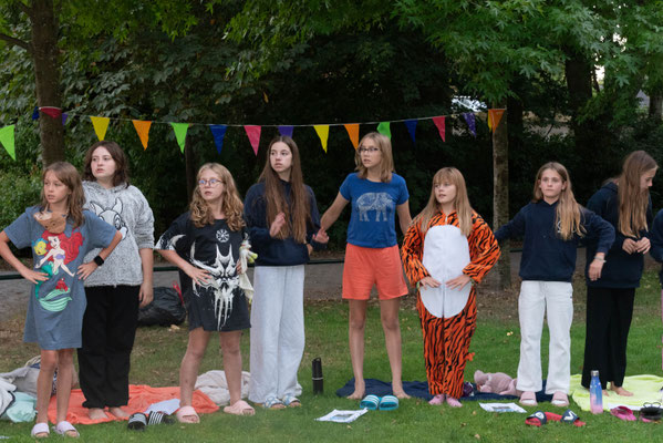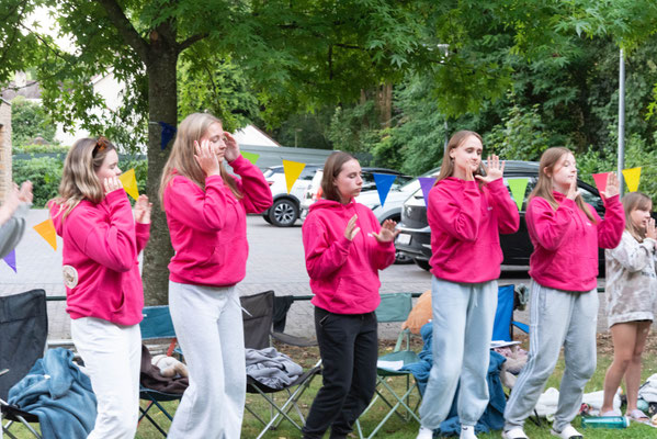 's Avonds begon de grote show. De Kwiks en Speelclub hadden een leuke quiz gemaakt, de Tippers een spectaculaire dans en de Ribbels speelden een toneeltje samen met hun leidsters. Na veel gelach en applaus was het tijd voor de grote afsluiter. Stoppende leidsters Lorana en Katlijne staken het mooie kamplicht aan, en we zongen de traditionele Chiroliedjes.
