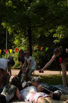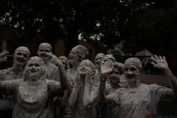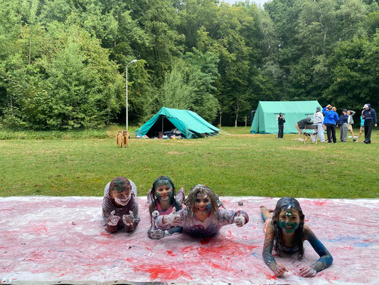 De volgende dag begon opnieuw met regen. Dat hield de Ribbels niet tegen, zij speelden klassieke vettige spelletjes: verftwister, elkaar versieren met scheerschuim en knikkers uit een kom bloem vissen met hun mond! Ondertussen speelde de Speelclub het Minionspel, terwijl de Kwiks het Smurfenspel speelden. Het leek wel een IKEA met al die blauwe en gele gezichtjes!