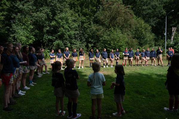 De dozen werden gemaakt, het materiaal terug gezocht en de tenten afgebroken. Vanaf 16u werden de mama's en papa's ontvangen op onze kampwei! Nu werd het tijd om nog 1 keer de afdelingsliedjes te zingen in het vierkant en de kampdans aan alle ouders te tonen. We bedankten onze lieve helpers, de kookploeg, de leiding en uiteraard de leden!